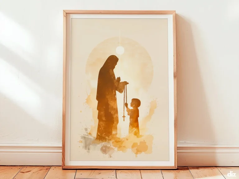 Mary’s calm gaze rests above gentle hands extending ivory beads and a clear crucifix. Warm gold light and soft rays keep the rosary at the compositional center.