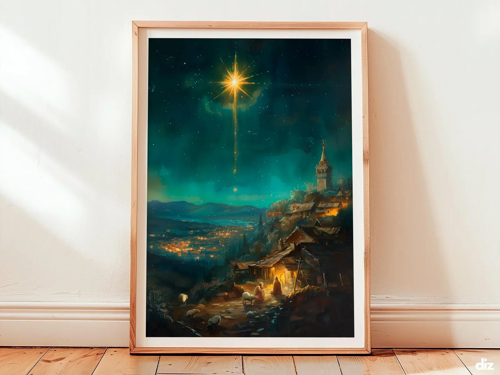 Framed Star of Bethlehem watercolor print centered over Bethlehem, devotional Christian wall art and religious artwork