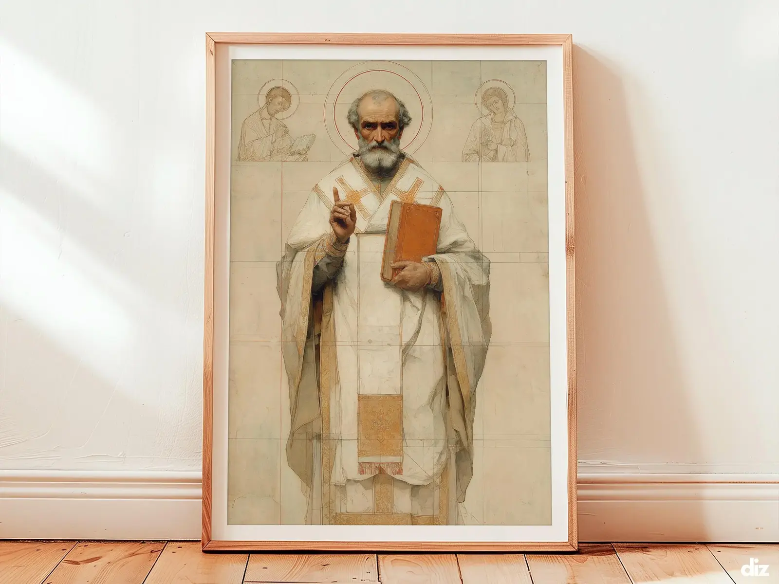 Minimal faith art print of Saint Nicholas with a thin golden halo and soft diagonal warm light, serene bishop form centered on ivory for calm christian wall art decor.